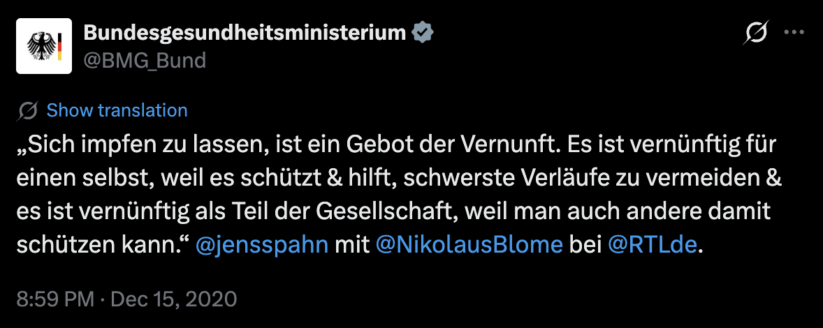 Dieses Narrativ wurde seit Beginn der Impfkampagnen aufgebaut. Exakt fünf Jahre vor Jens Spahns jüngstem Impf-Sager in der Enquete-Kommission, ebenfalls am 15. Dezember, wurde folgender Tweet durch sein Bundesgesundheitsministerium abgesetzt: