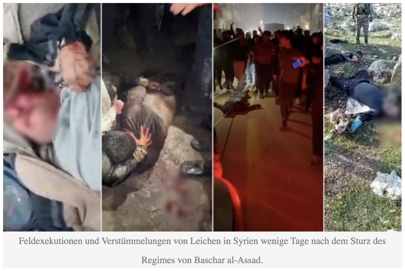 Zur Erinnerung: Die North Press Agency, eine syrische Nachrichtenagentur mit einem landesweiten Netzwerk aus Korrespondenten und Redakteuren, veröffentlichte am 11. Dezember 2024 einen erschütternden Bericht – überschrieben mit dem Titel: Wenige Tage nach dem Sturz Assads wurden in Syrien Hinrichtungen auf freiem Feld durchgeführt