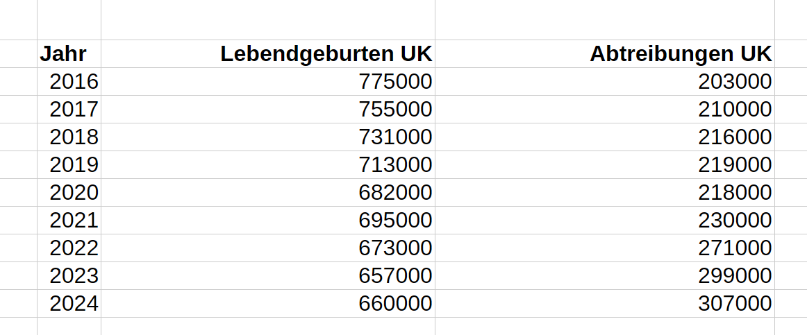 Im Internet kursiert eine Tabelle, welche schier unfassbare Abtreibungszahlen für das Vereinigte Königreich behauptet. Report24 hat sich das angesehen – und die offiziell belegten Zahlen sind noch schlimmer. In Großbritannien entlädt sich der Hass der 68er auf alles Eigene, Gute, Wahre und Schöne mit aller Gewalt. Bereits 2024 wurden über 300.000 Babymorde in Form von Abtreibung berichtet.